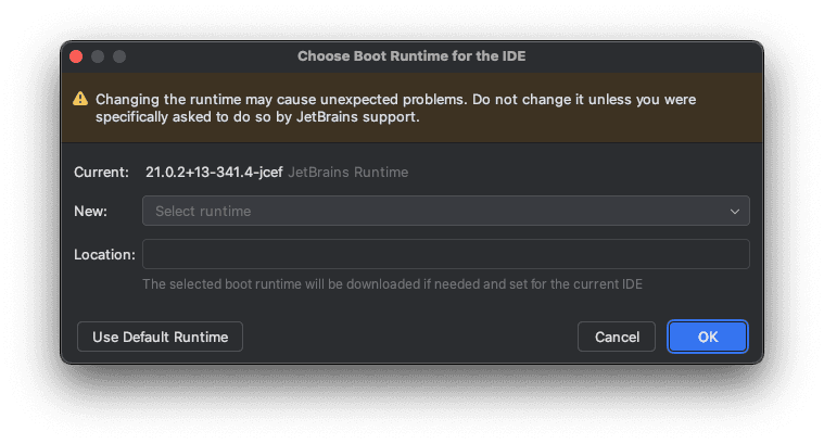 在 IDEA 打开的情况下,双击 shift 打开命令控制台 -> 输入 "Choose Boot Java Boot Runtime for the IDE" -> 选择最近的 JRE 版本(我是 21)-> OK 并重启 IDEA
