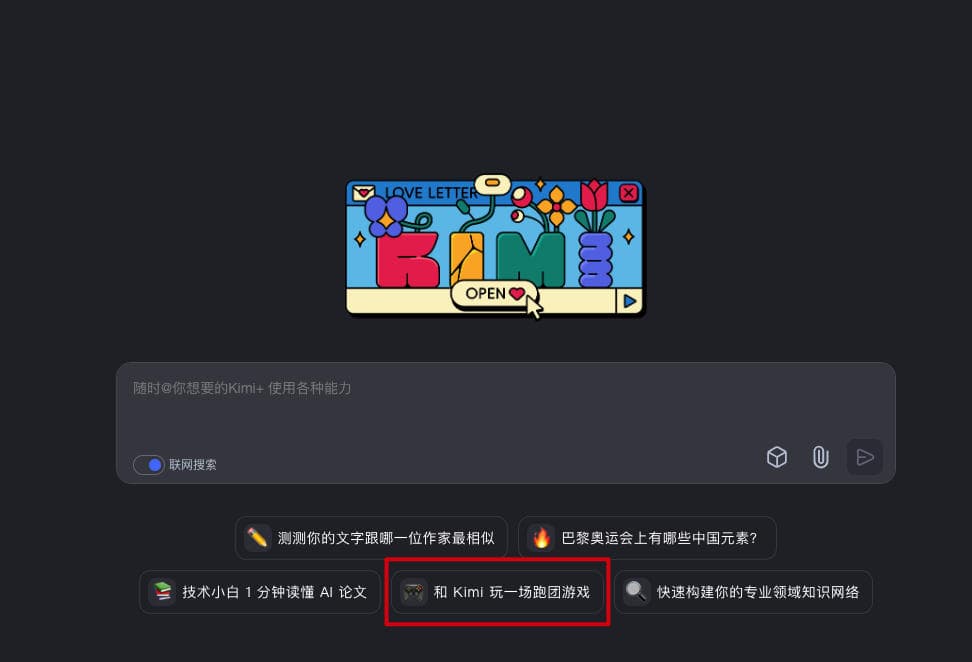 刚好,前两天,在用 kimi 查资料的时候,我看到首页上有这么一个按钮:“和 Kimi 玩一场跑团游戏”。